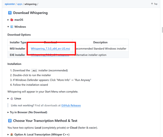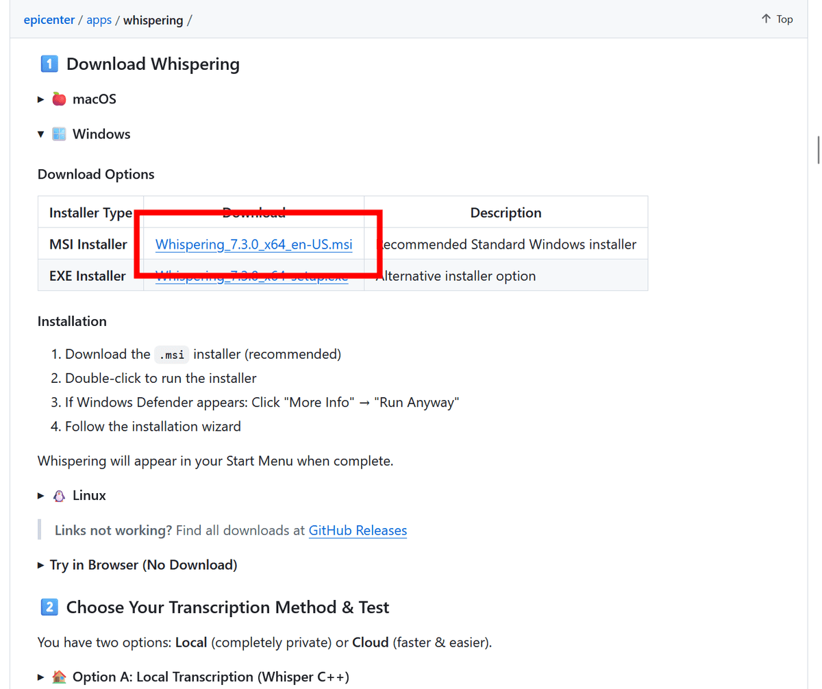 Whispering has official installation instructions for Windows, Mac, and Linux. For Windows, click the link to download Whispering_7.3.0_x64_en-US.msi and run the file.