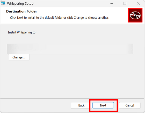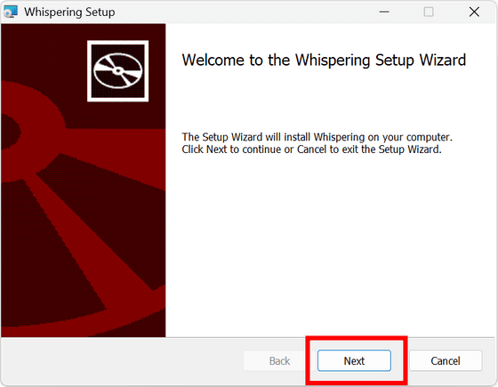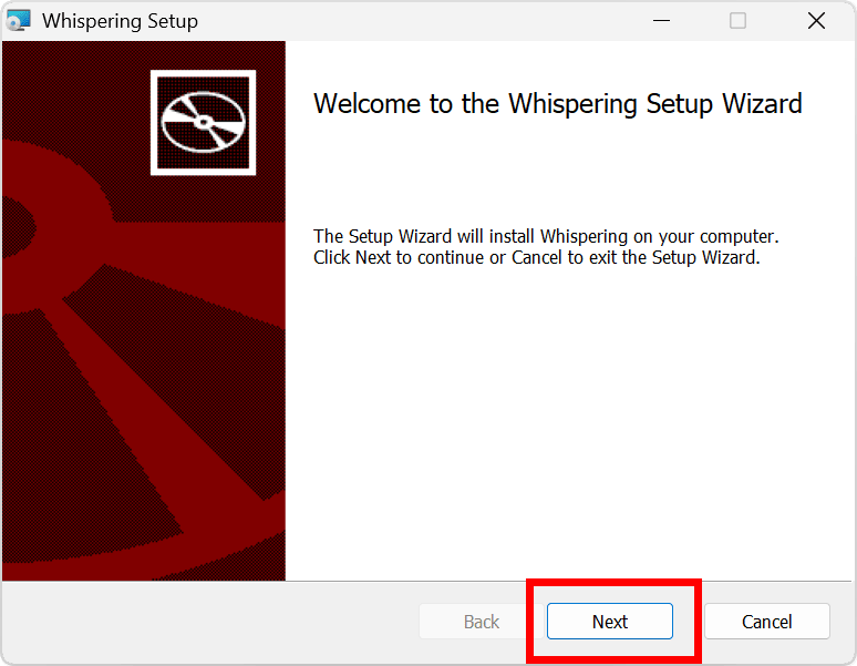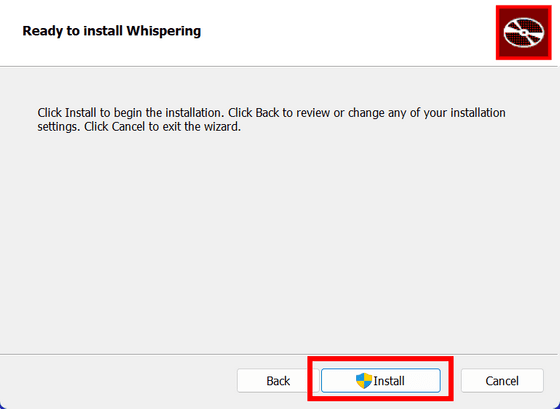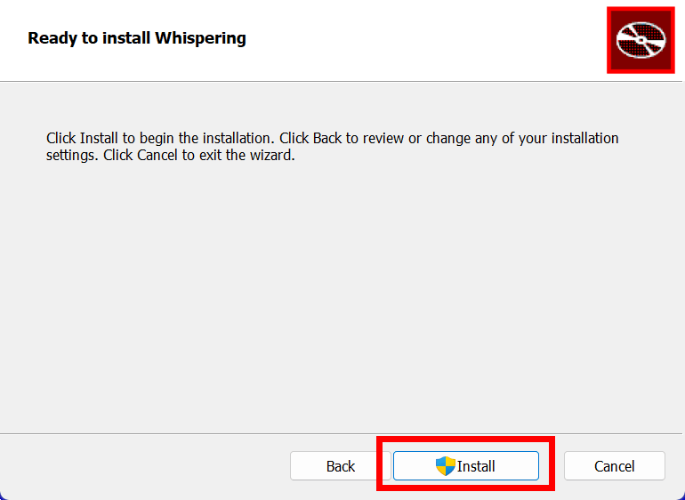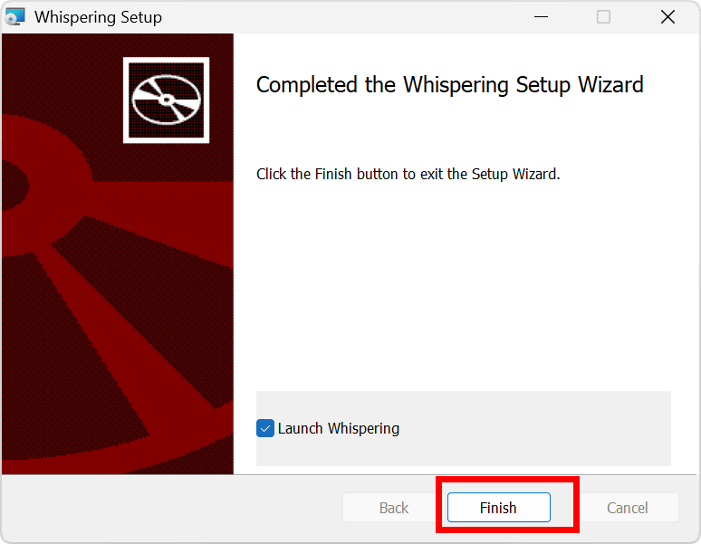 Once the installation is complete, click 'Finish' to launch Whispering.