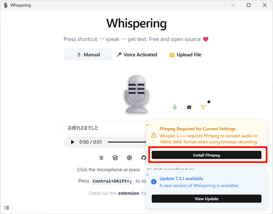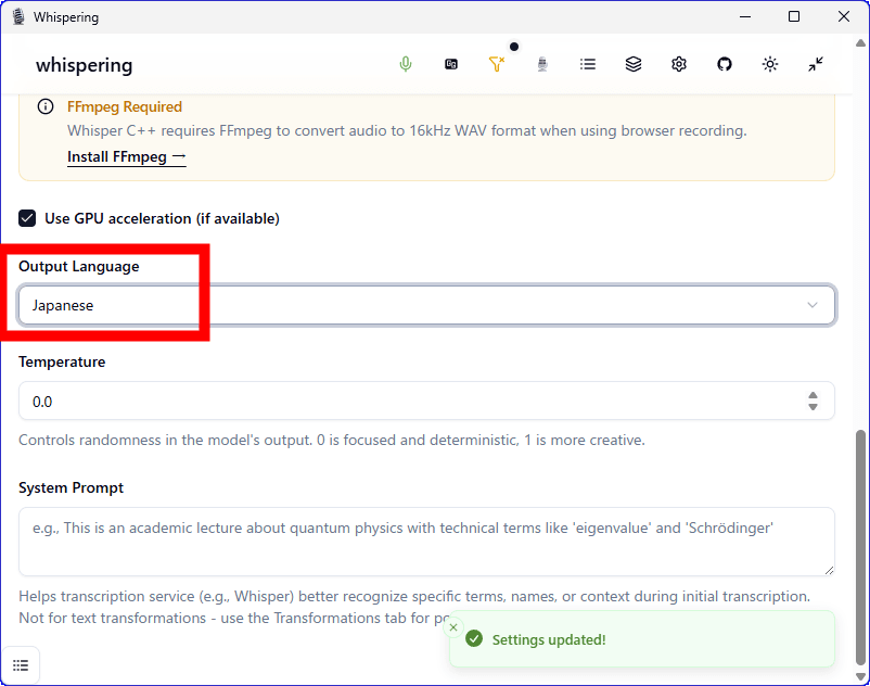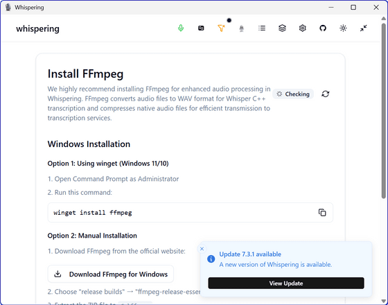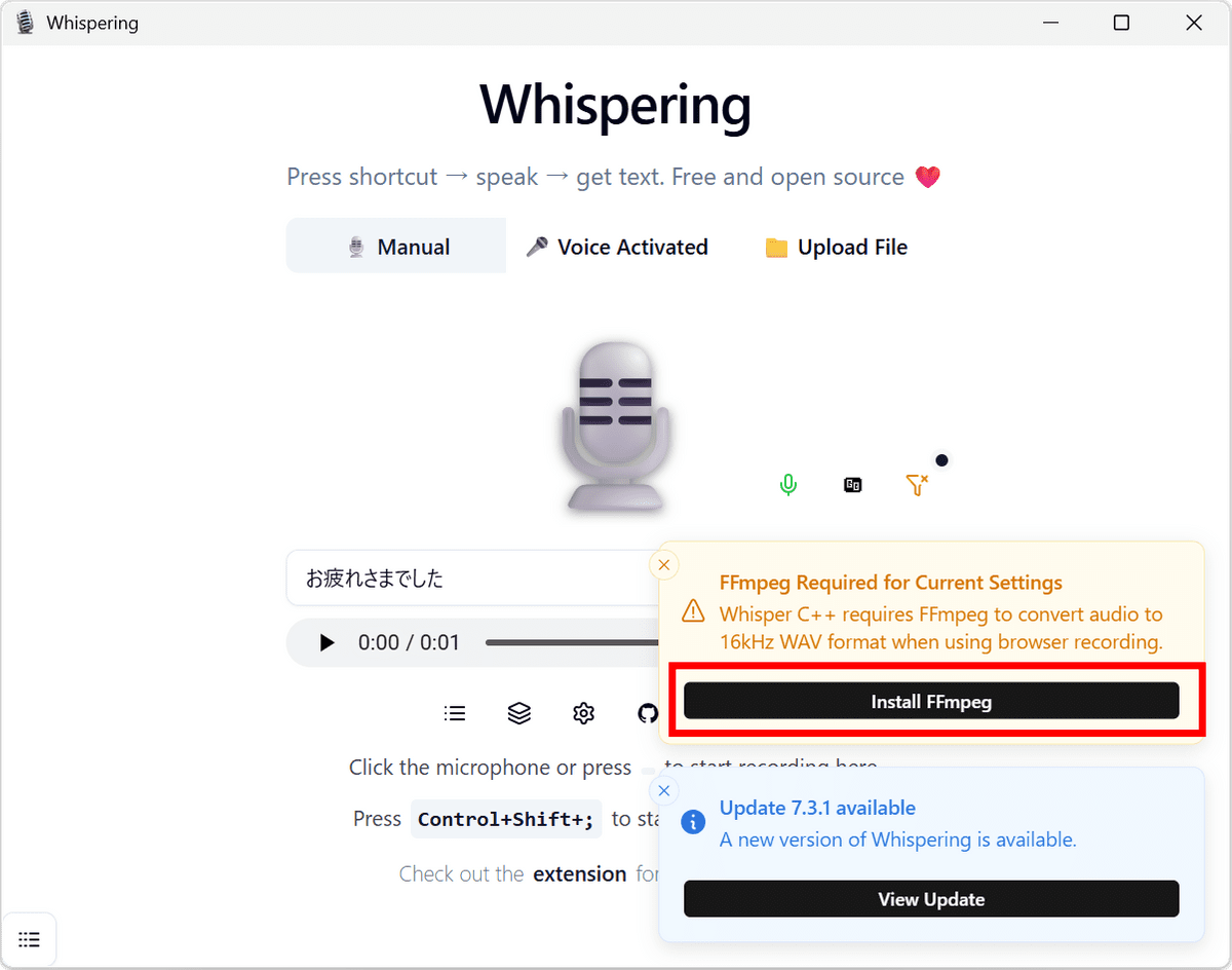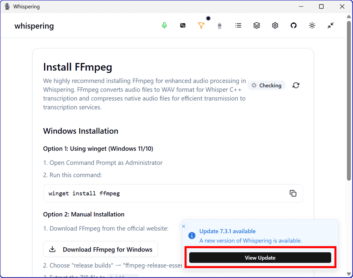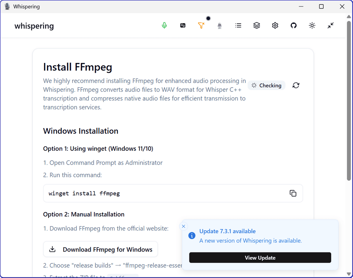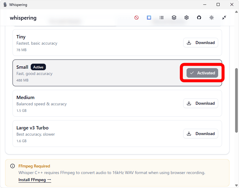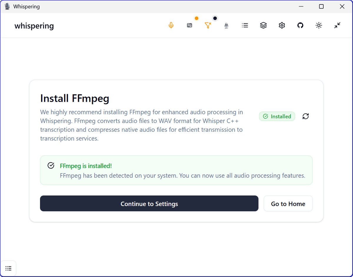 Restart Whispering and if it says 'FFmpeg is Installed' then the installation is complete.