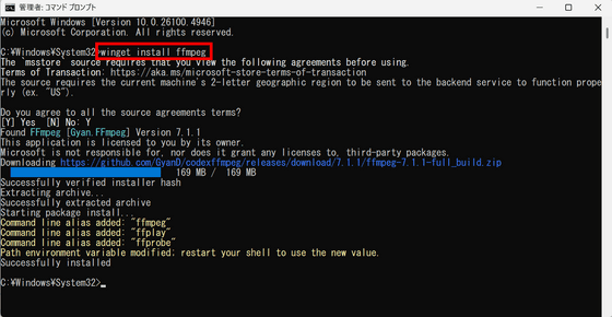 Paste the command 'winget install ffmpeg' in the instructions and press Enter to proceed with the installation.