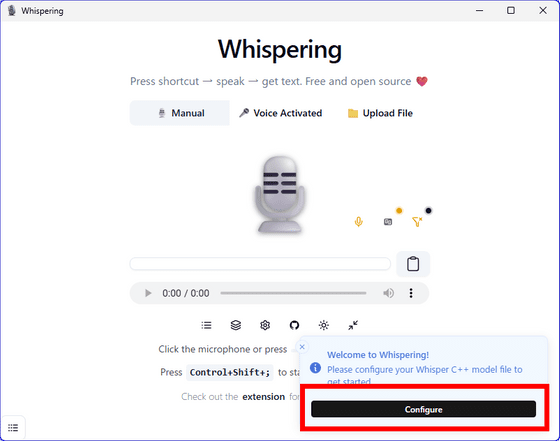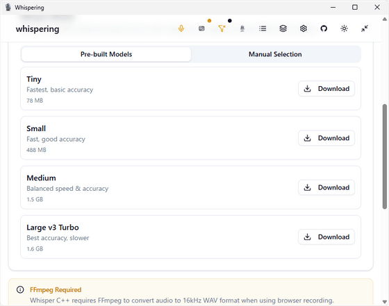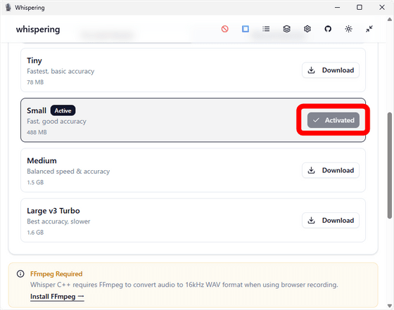 Download the model you want to use. There are four options: 'Tiny,' 'Small,' 'Medium,' and 'Large v3 Turbo.' If you just want to check the operation, 'Small' is the best.