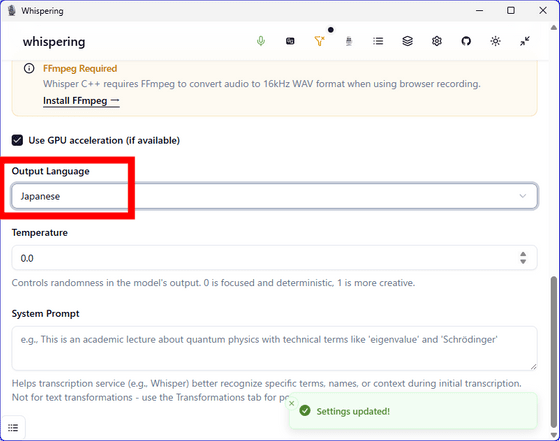 Additionally, scroll down on the model selection screen and change 'Output Language.' The default is Auto, but Auto does not respond well to Japanese, so when recording in Japanese, it is better to explicitly select 'Japanese.'