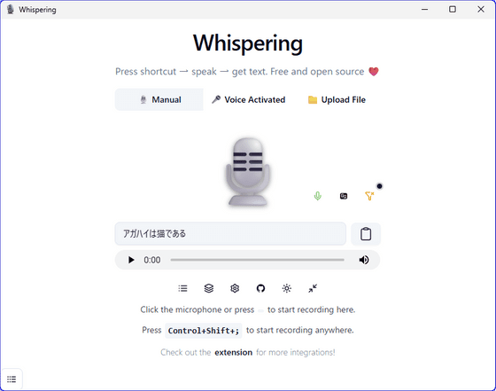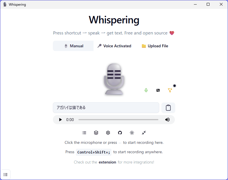 Return to the main menu and press the keyboard shortcut 'Space' (to toggle recording on/off) or 'P' (push-to-talk) to speak. The app will automatically record, transcribe, and even copy the transcribed text. Below is the result of me speaking 'I Am a Cat,' and the accuracy of the Small model seems to be moderate. However, I was unable to download the Medium or higher models, so I gave up on using anything other than the Small model.