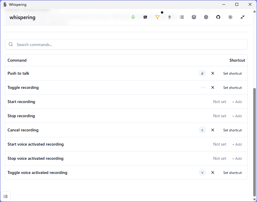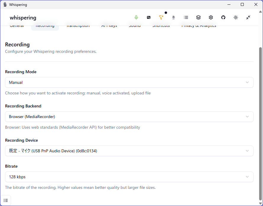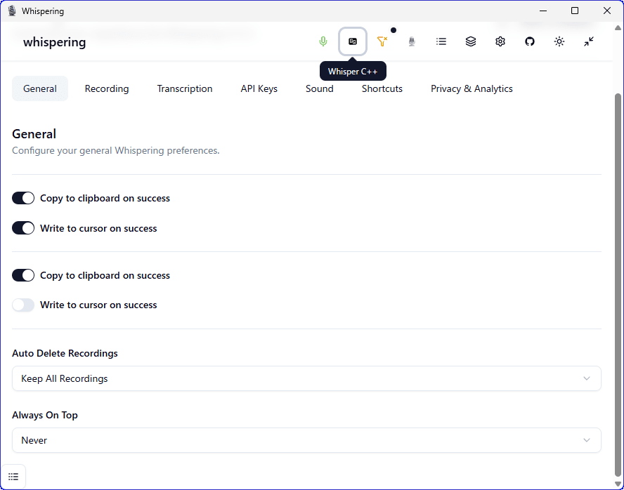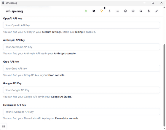 Settings for using API keys, etc. Whispering supports API keys from OpenAI, Anthropic, Groq, Google, and ElevenLabs, and by entering an API key, you can process transcription via each service instead of locally.