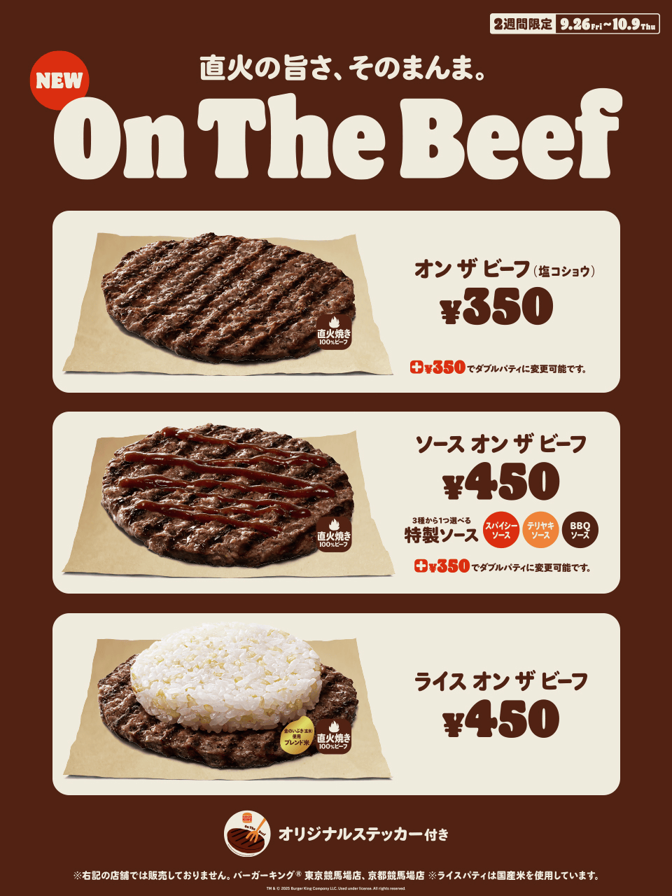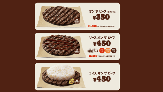 Burger King will be releasing three types of ' On the Beef ' that 'allow you to enjoy the deliciousness of the patty as it is' for a limited two-week period starting Friday, September 26, 2025. The 'On the Beef' seasoned with salt and pepper is 350 yen, the 'Sauce on the Beef' which allows you to choose one of three special sauces is 450 yen, and the 'Rice on the Beef' which comes with rice is also 450 yen.