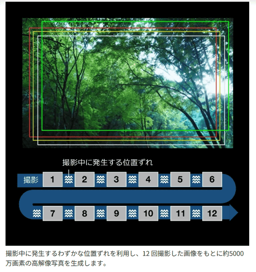 The OM-5 Mark II is equipped with 'Tripod High Res Shot' and 'Handheld High Res Shot.' Tripod High Res Shot is a function that takes pictures while the sensor is moved while the camera is completely fixed on a tripod, and then combines them into a high-resolution photo. In contrast, Handheld High Res Shot takes advantage of the 'tiny camera shake that inevitably occurs when shooting handheld' and combines 12 'photos taken at different sensor positions' to create a high-resolution photo. The explanatory image from the introduction page of the previous-generation model, the 'OM-5,' is easy to understand, so I've included it below.