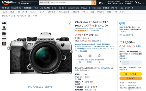 The OM-5 Mark II has an open price, and is sold on Amazon.co.jp as a set with the M.ZUIKO DIGITAL ED 12-45mm F4.0 PRO for 171,636 yen (tax included).