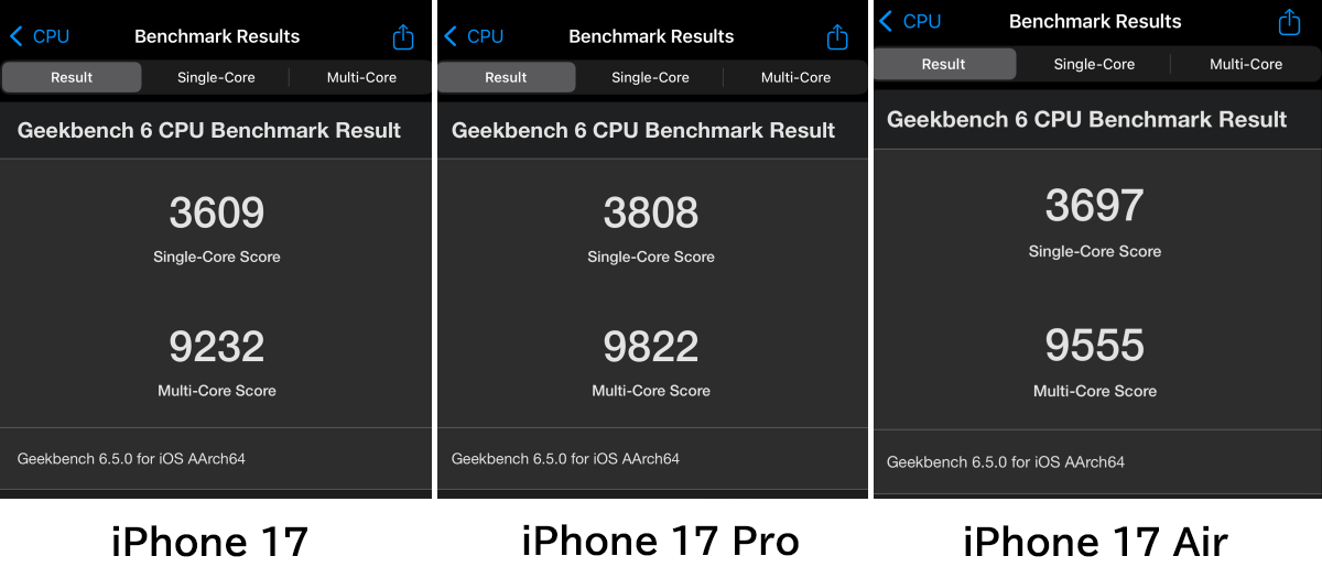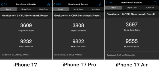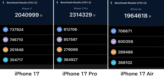 Simultaneous benchmark test of 'iPhone 17', 'iPhone 17 Pro', and 'iPhone Air', exploring the performance differences between the original, Pro, and Air