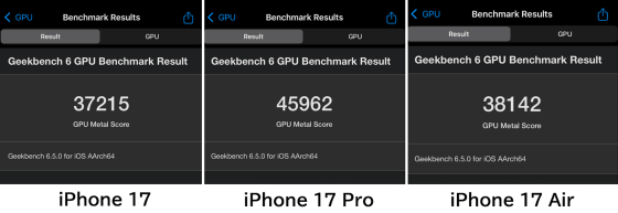 The GPU test scores were 37,215 for the iPhone 17, 45,962 for the iPhone 17 Pro, and 38,142 for the iPhone Air.