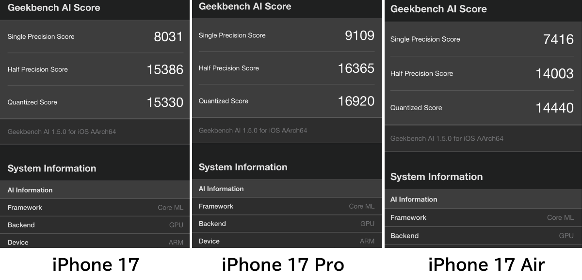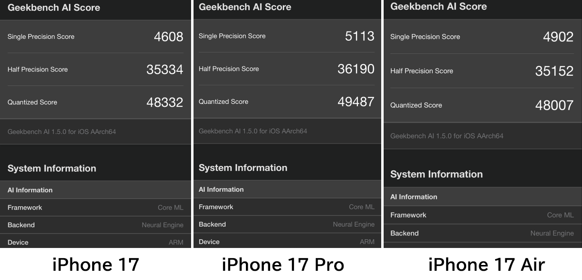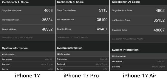 When using the AI processing core 'Neural Engine,' the single-precision score was 4608 for the iPhone 17, 5113 for the iPhone 17 Pro, and 4902 for the iPhone Air.