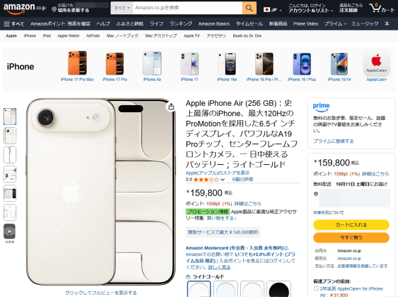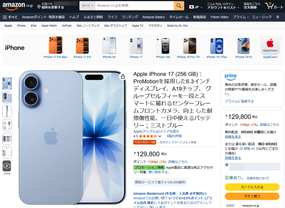 The starting prices for each model are 129,800 yen for the iPhone 17, 179,800 yen for the iPhone 17 Pro, and 159,800 yen for the iPhone Air. Each model is also available on Amazon.co.jp.