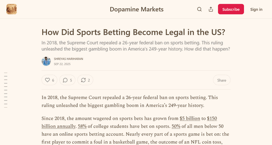 According to iGaming Business , a media outlet focusing on the online gambling industry, betting amounts in Nevada increased 2.9% and winnings increased 21.2% in 2018, reaching record highs. Total sports betting amounts are expected to increase from $5 billion (approximately $740 billion) to $150 billion (approximately ¥22 trillion) annually between 2018 and 2025. Other data also shows that 58% of college students have bet on sports, and 50% of men under 50 have an online sports betting account.
