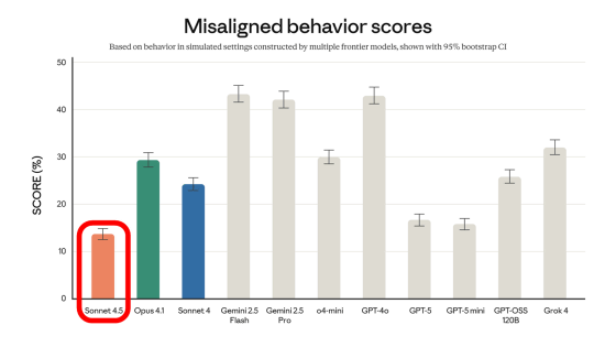 Claude Sonnet 4.5 also features a lower risk of misbehavior, such as deception, subservience, power-seeking, fostering delusions, and obedience to harmful system prompts. The graph below shows the risk of misbehavior for various AIs, with Claude Sonnet 4.5 showing the lowest risk.