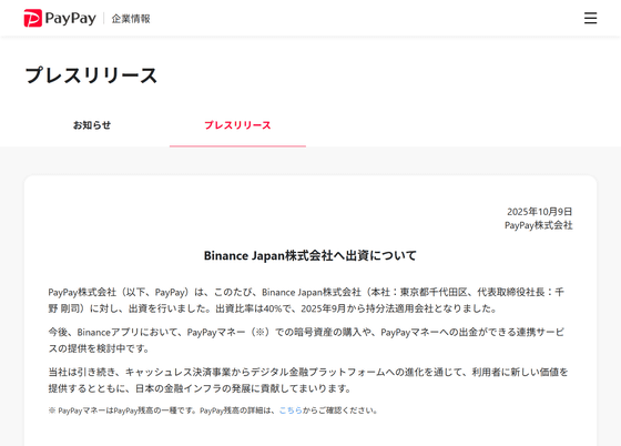 Investment in Binance Japan Co., Ltd. | Press Release on October 9, 2025 | PayPay Corporation
