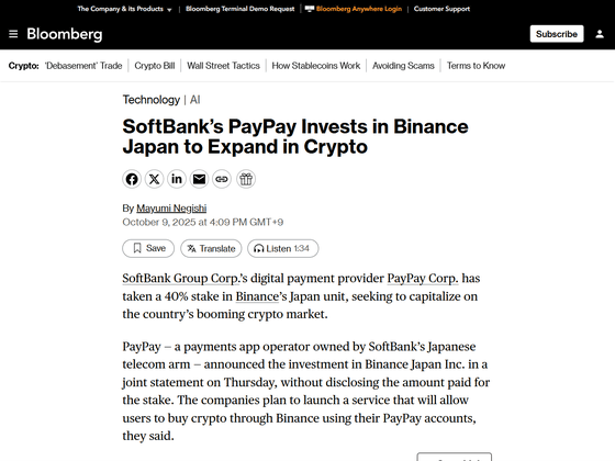https://www.bloomberg.com/news/articles/2025-10-09/softbank-s-paypay-invests-in-binance-japan-to-expand-in-crypto