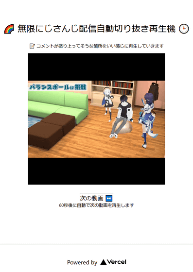また、「次の動画」をクリックしなくても60秒すれば自動で次の動画に遷移します。そのため、無限にじさんじ配信自動切り抜き再生機を表示したまま放置していれば、ほぼ無限にいろんなライバーの配信のここぞというポイントが無限に表示されます。