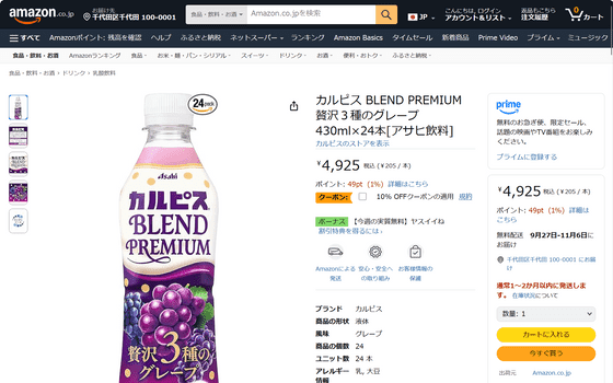 「カルピス BLEND PREMIUM 贅沢3種のグレープ」の希望小売価格は税込205円です。Amazon.co.jpでは、24本入りが税込4925円(1本あたり約205円)で販売されています。