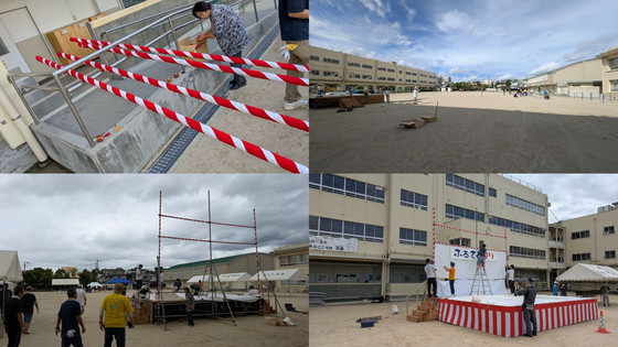 前日準備にはGIGAZINE編集長も朝から参加し、GIGAZINE提灯がぶら下げられるステージ背後の紅白ポールを作成。さらに各夜店のテント設営、机並べ、コンパネ運びなどなども。