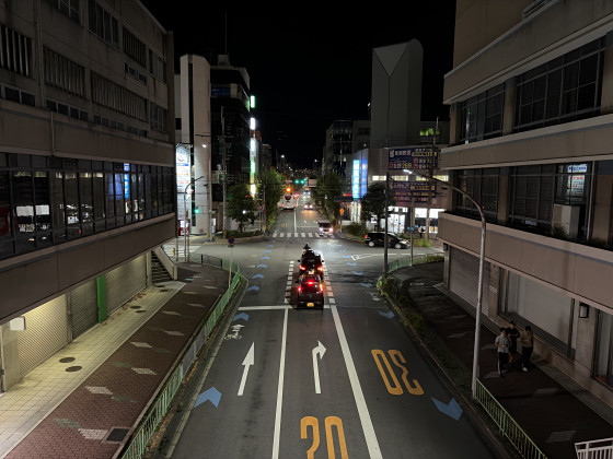 夜間に歩道橋の上から車道を撮影。一昔前のスマートフォンではこれくらいの暗さだとシャッターボタンをタップしてから数秒間静止する必要がありましたが、iPhone Airでは昼間と同様に瞬時に撮影できました。