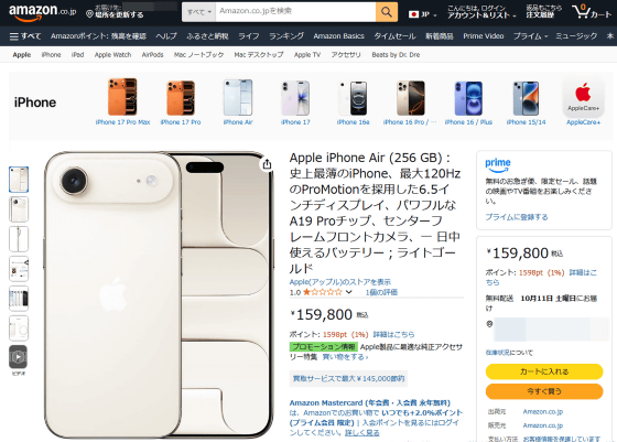 iPhone Airの256GBモデルは税込15万9800円で、Amazon.co.jpでも入手可能です。