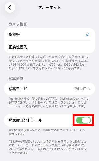 写真を撮影する前に、48メガピクセルで写真を記録できるようにするべく、カメラの設定で「解像度コントロール」をONに切り替えました。