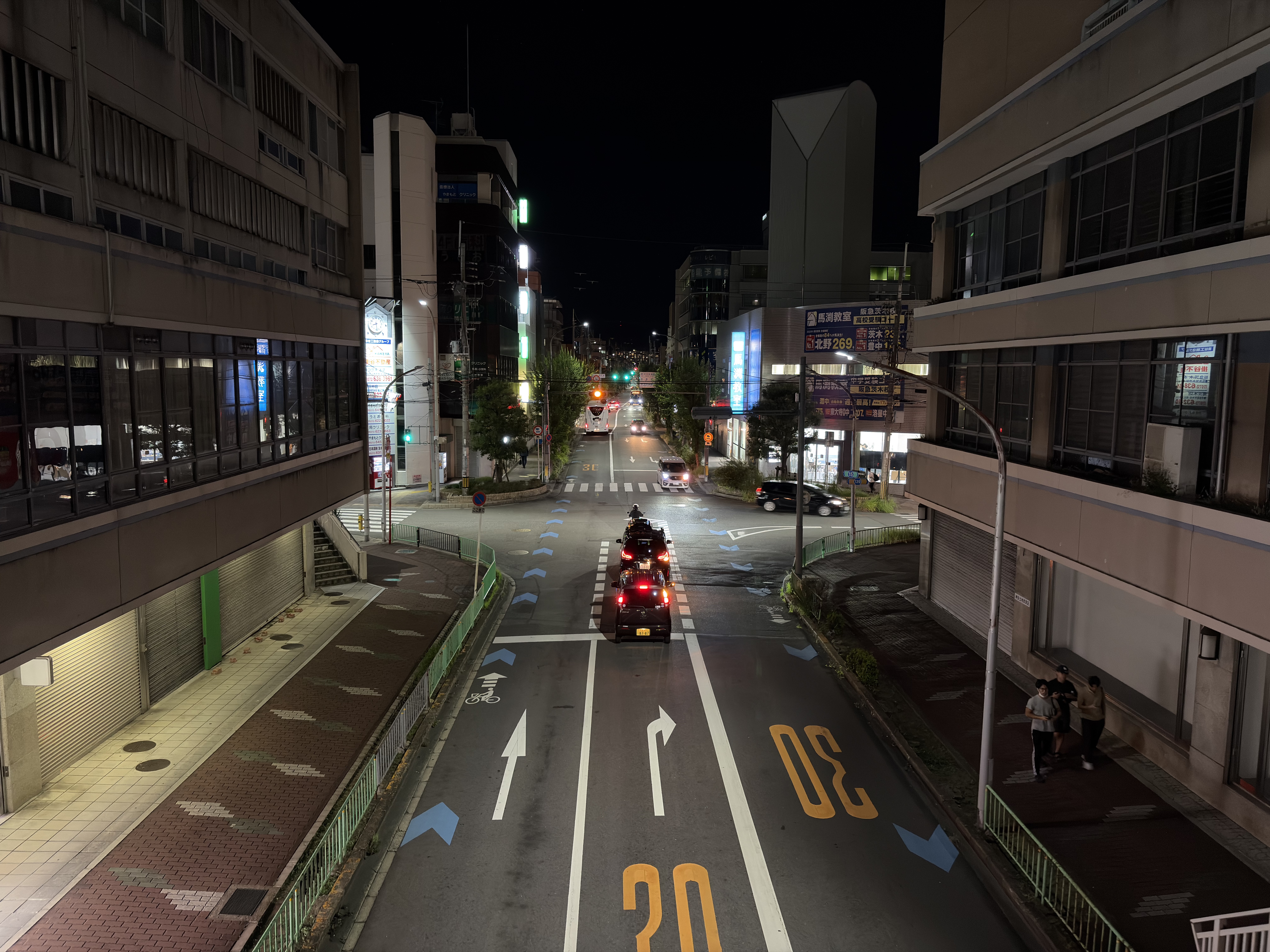 夜間に歩道橋の上から車道を撮影。一昔前のスマートフォンではこれくらいの暗さだとシャッターボタンをタップしてから数秒間静止する必要がありましたが、iPhone Airでは昼間と同様に瞬時に撮影できました。