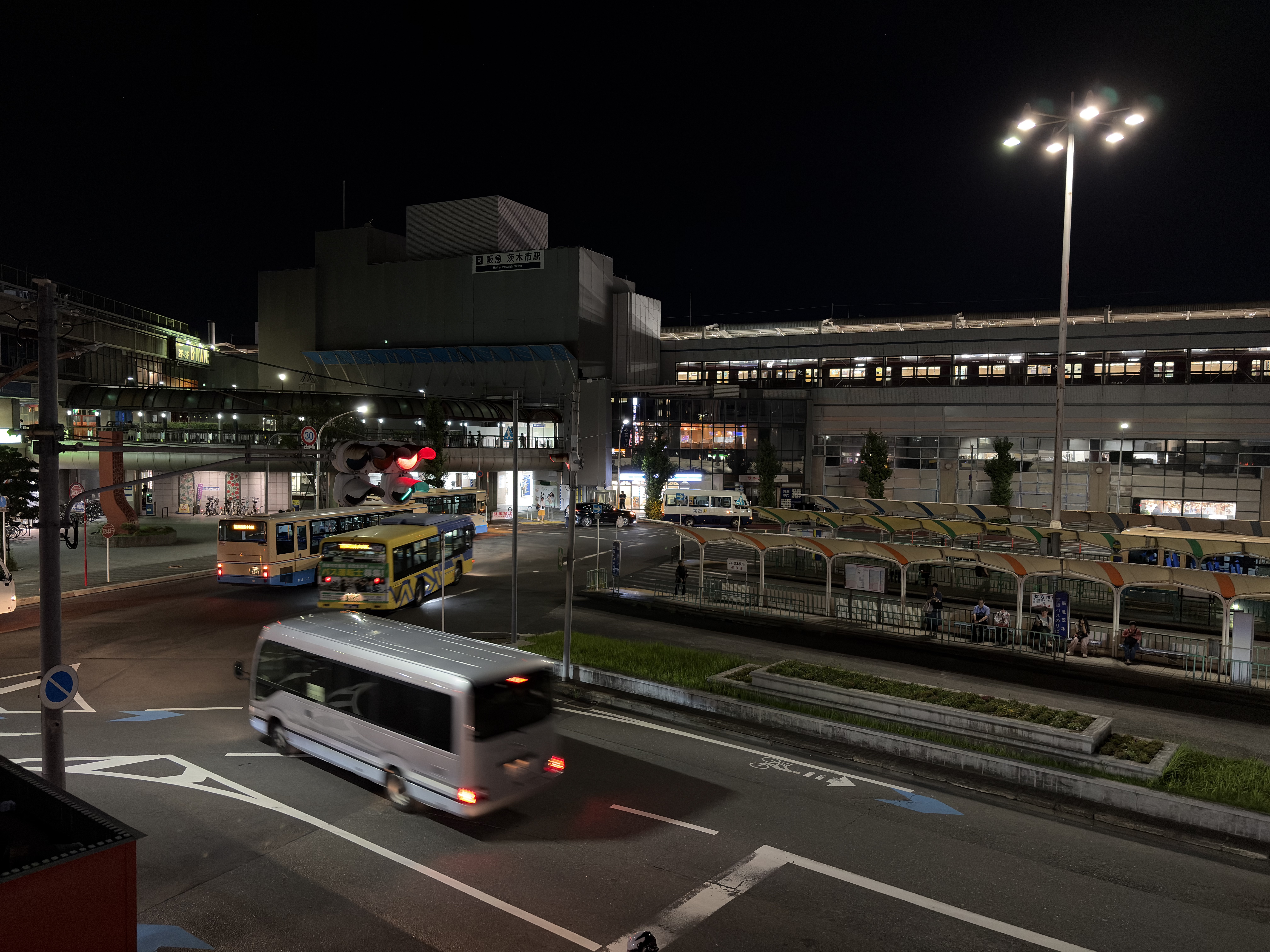 バスターミナルも撮影。右上の大型照明の周りにゴーストが発生しています。