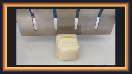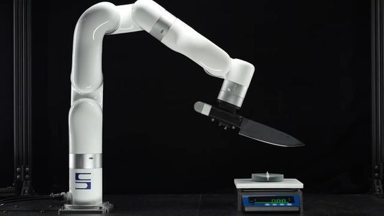 切断時の力を正確に測定しつつ切ることができるロボットを使用し、超音波包丁の性能をチェックしてみます。