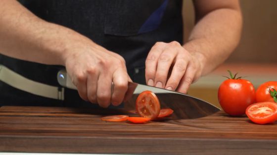 超音波の振動は見た目には一切分からず、包丁を持っている手にも伝わりません。しかし、すっと刃を入れるだけでトマトが薄くスライスされました。
