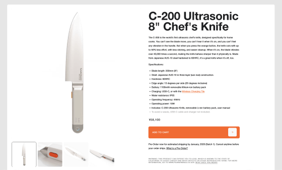 ハイメンディンガー氏が開発した「C-200 Ultrasonic Chef's Knife」は、ワイヤレス充電ケースなしのバージョンで税込5万8100円。