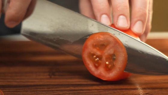 超音波の振動は見た目には一切分からず、包丁を持っている手にも伝わりません。しかし、すっと刃を入れるだけでトマトが薄くスライスされました。