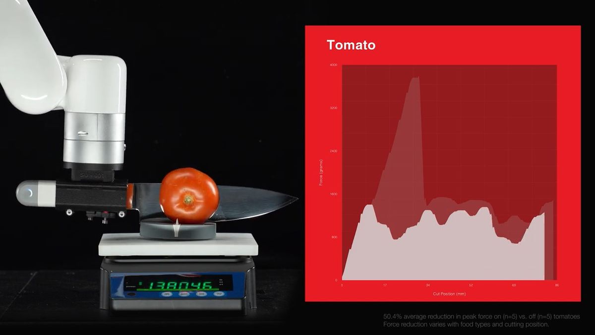 切断時の力を正確に測定しつつ切ることができるロボットを使用し、超音波包丁の性能をチェックしてみます。