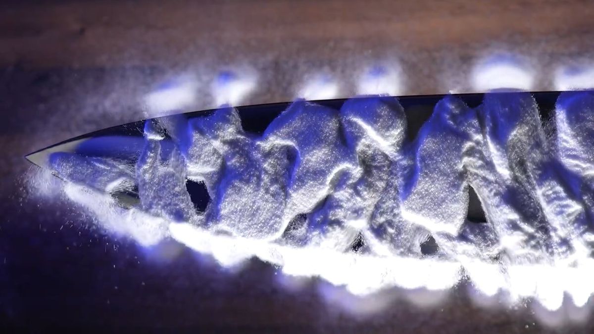 ハイメンディンガー氏が開発した超音波包丁をスローモーションで見ると、刃がわずか10~20ミクロンだけ前後に振動しています。この動きが1秒間に4万回以上という高頻度で繰り返されるため、刃が摩耗してもよく切れるという仕組みです。
