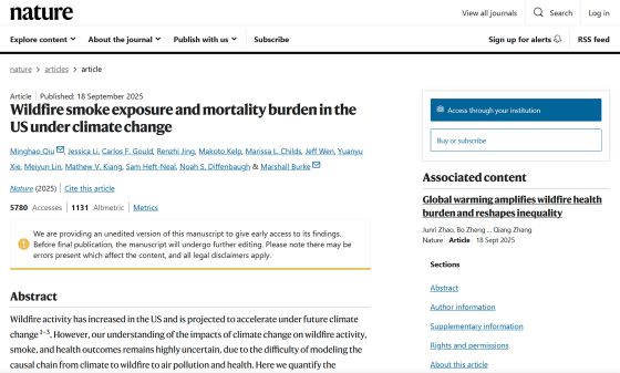 近年はアメリカやオーストラリアで大規模な山火事が頻発しており、2025年にカリフォルニア州で起きた山火事では火災の範囲が東京23区の面積のおよそ3分の1に及び、少なくとも29人が死亡したほか、1万8000棟を超える建物が被災しました。新たに科学誌のNatureに掲載された論文では、アメリカでは地球温暖化によって山火事の煙による死者数が増加し、2050年までに年間7万人に達する可能性があると報告されました。